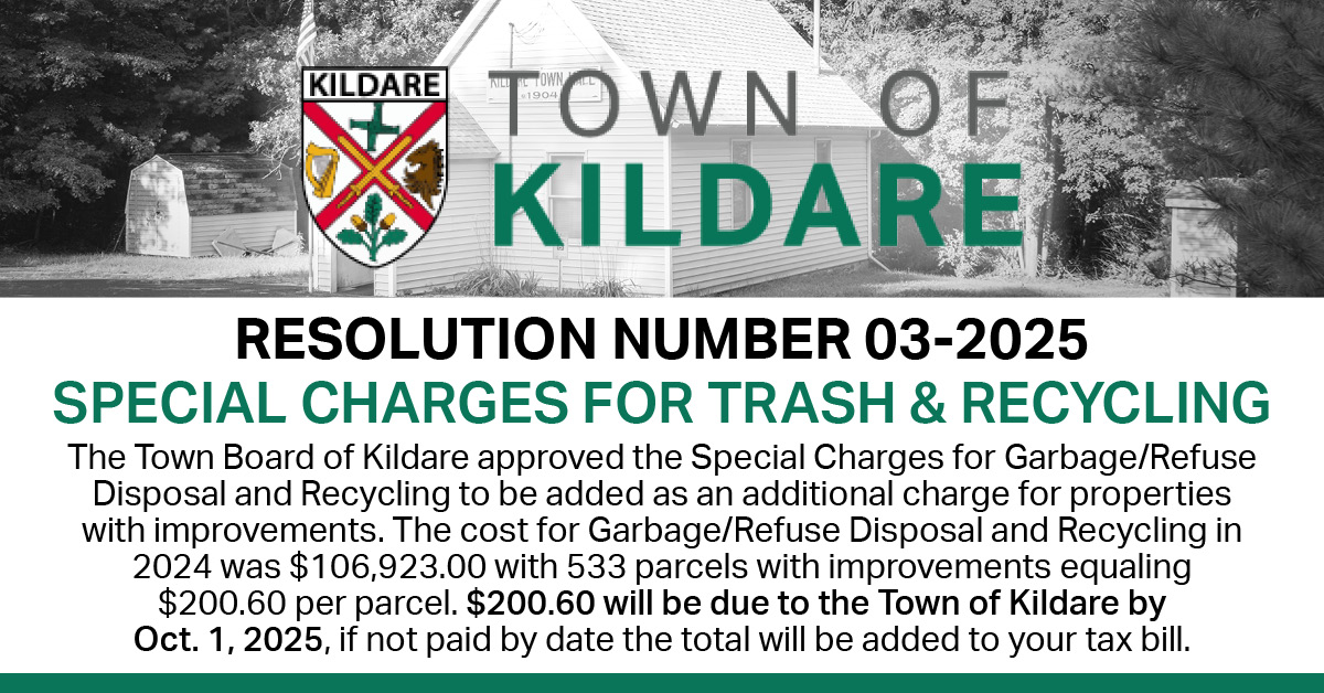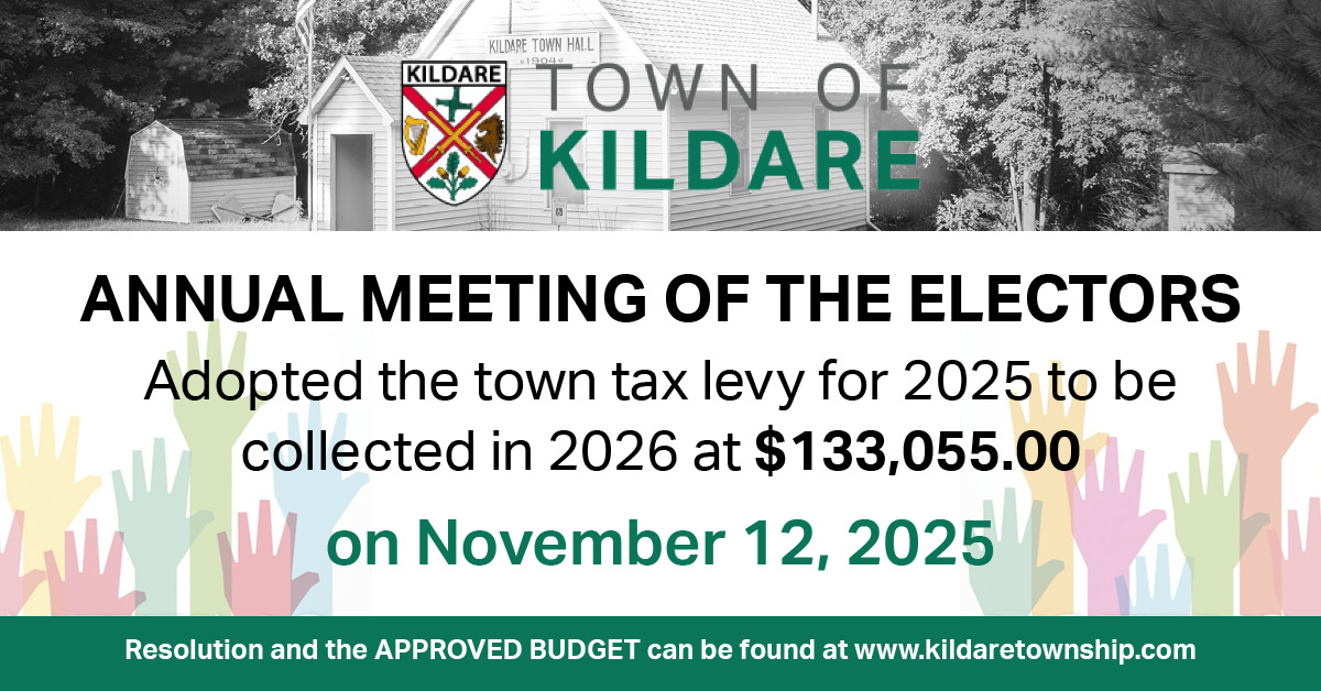 The Town of Kildare held a 2025 Town Budget Hearing followed by a Meeting of Electors that approved the adoption of the Town Levy. The proposed budget was approved following the Levy approval at the Regular Board Meeting.